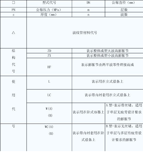 表示:公稱通徑為Φ500,工作壓力為0.6MPa,(6kg/cm2)波數(shù)為4個(gè),帶導(dǎo)流筒,碳鋼法蘭連接的內(nèi)壓式波紋膨脹節(jié)。